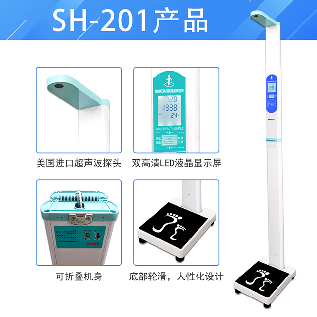 上禾SH-201打印款智能雙屏電子身高體重測量?jì)x,作為專(zhuān)業(yè)體檢設備,采用美國進(jìn)口Sens Comp超聲傳感器,同時(shí)具備環(huán)境溫度自動(dòng)補償功能,身高分度0.01cm,體重分度0.01kg;雙屏設計均為液晶顯示屏,上屏5寸,顯示身高、體重、BMI身體健康指數,下屏3寸,顯示二維碼和使用單位宣傳語(yǔ);全自動(dòng)測量、液晶電子顯示、語(yǔ)音播報三合一,數據可通過(guò)RS232接口、藍牙等功能進(jìn)行傳輸保存;自動(dòng)高速熱敏打印,結果易于儲存,支持微信掃碼,測量結果直達手機。